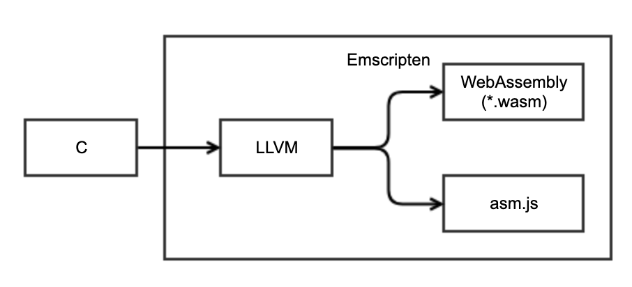 Emscripten 编译到 LLVM,然后生成 WebAssembly。