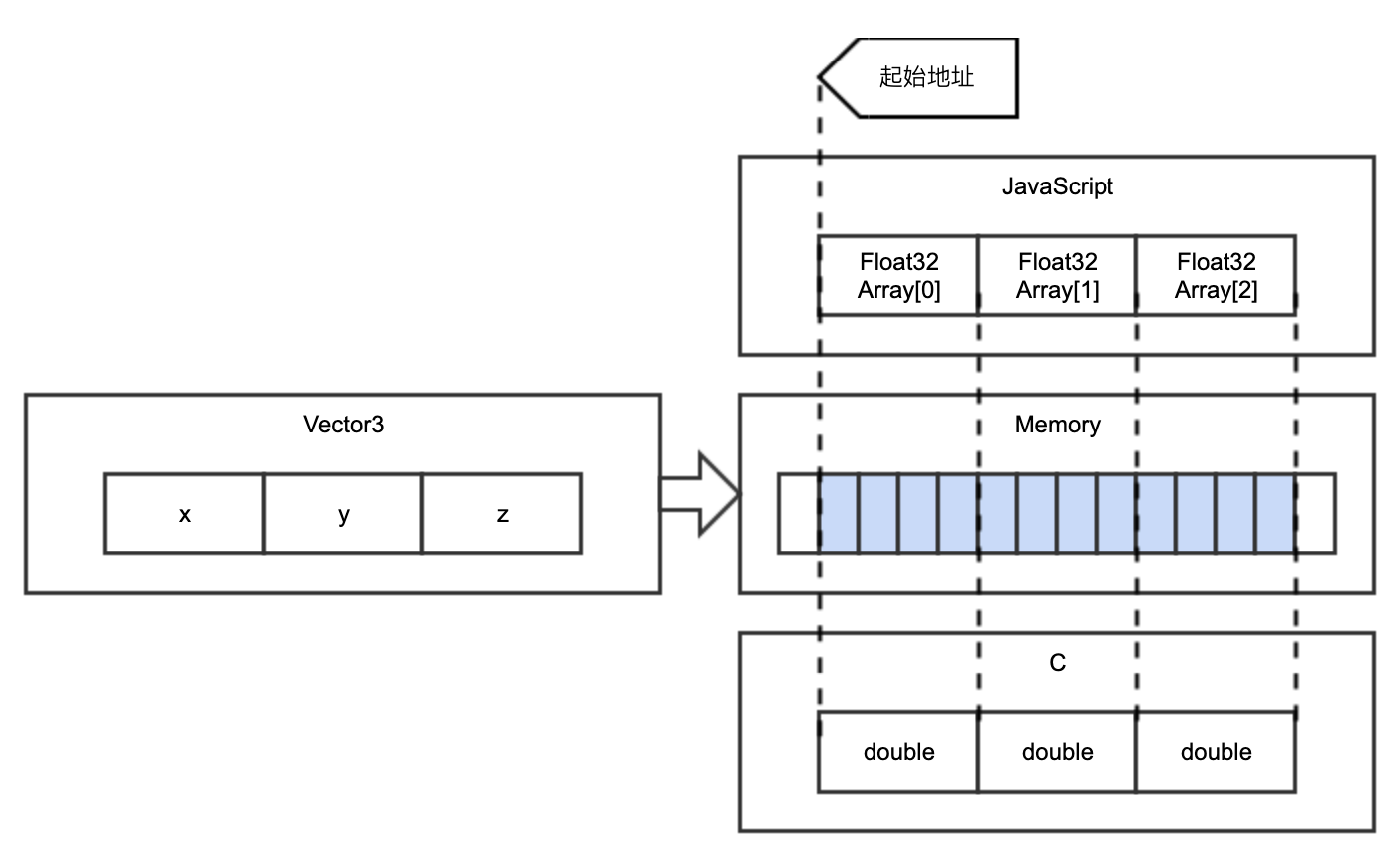 这个结构化的数据 _v 应当放入 JavaScript 和 WebAssembly共享的内存之中。放在哪?类似 C 的 malloc,通过 Module 申请一块长度为 3的内存,把 _v 放进去。这里 malloc 申请了 3 个 4 字节的内存空间、_vAddr右移两位等于 _vAddr/4,都是因为每个 double 数值都占 4 个字节。