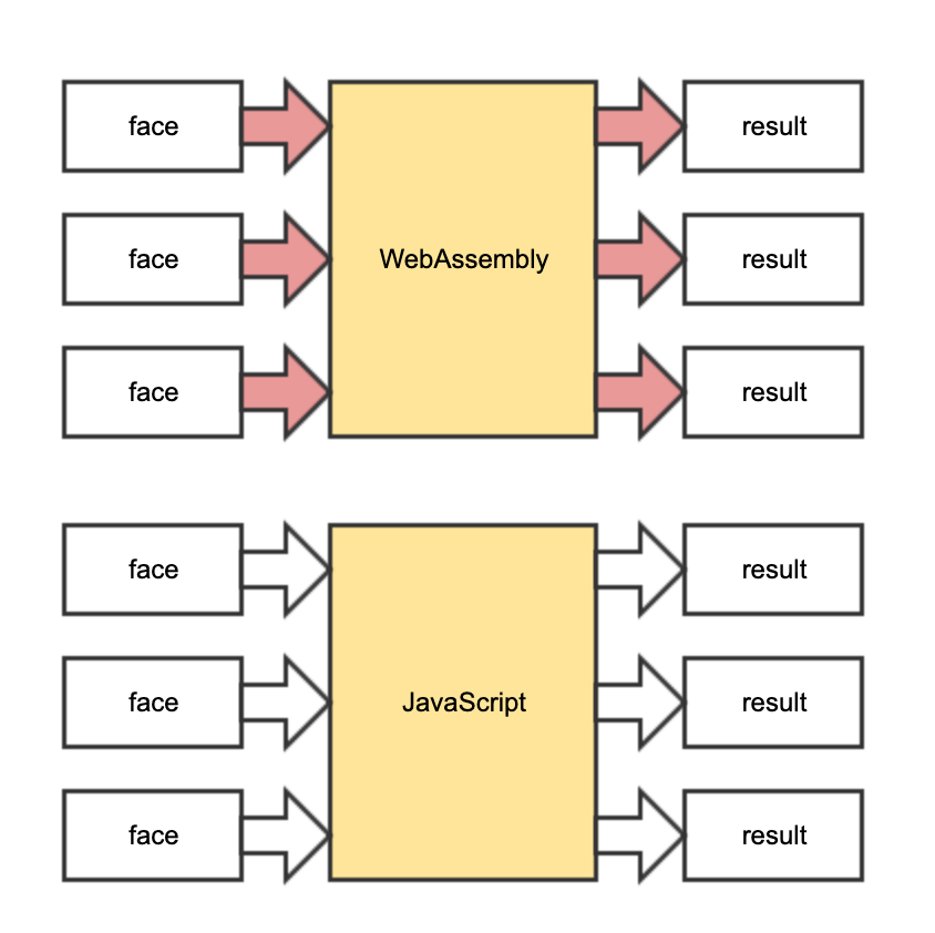 在这种情况下,应该怎么办?得出 “WebAssembly 在实际应用中比 JavaScript慢” 的结论然后放弃使用 WebAssembly 吗?当然不是。WebAssebmly作为一项高性能技术(高性能使得它相对来说偏向底层一些),应当让它多做并且集中地做自己擅长的事情:计算。为此,我们尝试用批处理的方式节省多次数据转换到共享内存的开销。我们在C 端增加一个批处理接口,同时在 JavaScript 端以批处理形式进行 I/O访问。即:这个批处理的输入是面的数组,输出也是面的数组。这样每次调用WebAssembly 可以处理一组面,大幅度降低数据转换的频率。